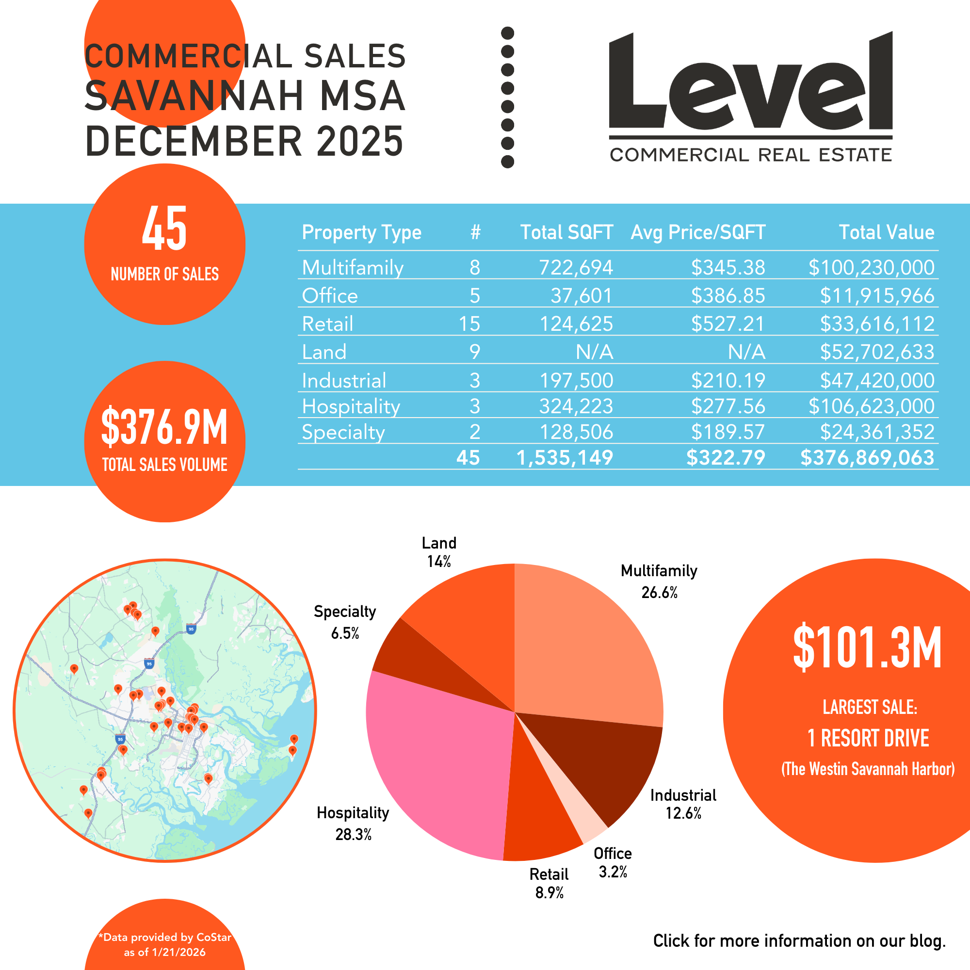Savannah MSA commercial sales finished the year strong in December 2025. The number of transactions more than doubled recent monthly averages to reach 45 sales, with sales volume topping $375M. Multifamily and hospitality properties with proven performance drove volume, aligning with existing market trends. Unlike previous months, we saw strong sales across diverse asset classes. Several small retail properties exchanged hands in the urban core, and there were solid land transactions in the outer areas of the MSA.