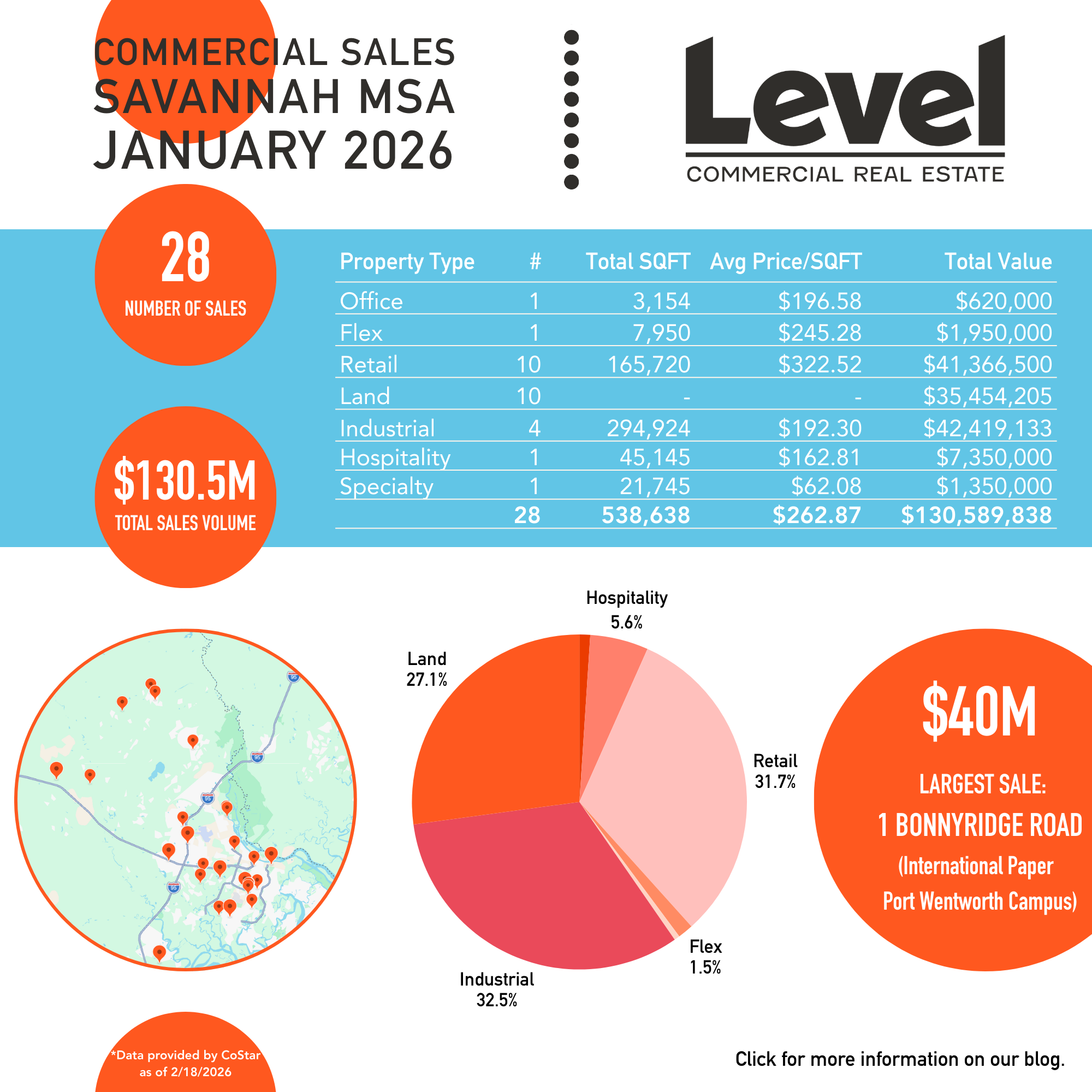 The first month of the new year saw consistent performance across multiple asset classes in the Savannah area commercial market. With 28 sales transactions and $130.6M in sales volume, January was on par with most months in the second half of 2025, but fell short of December’s strong performance.